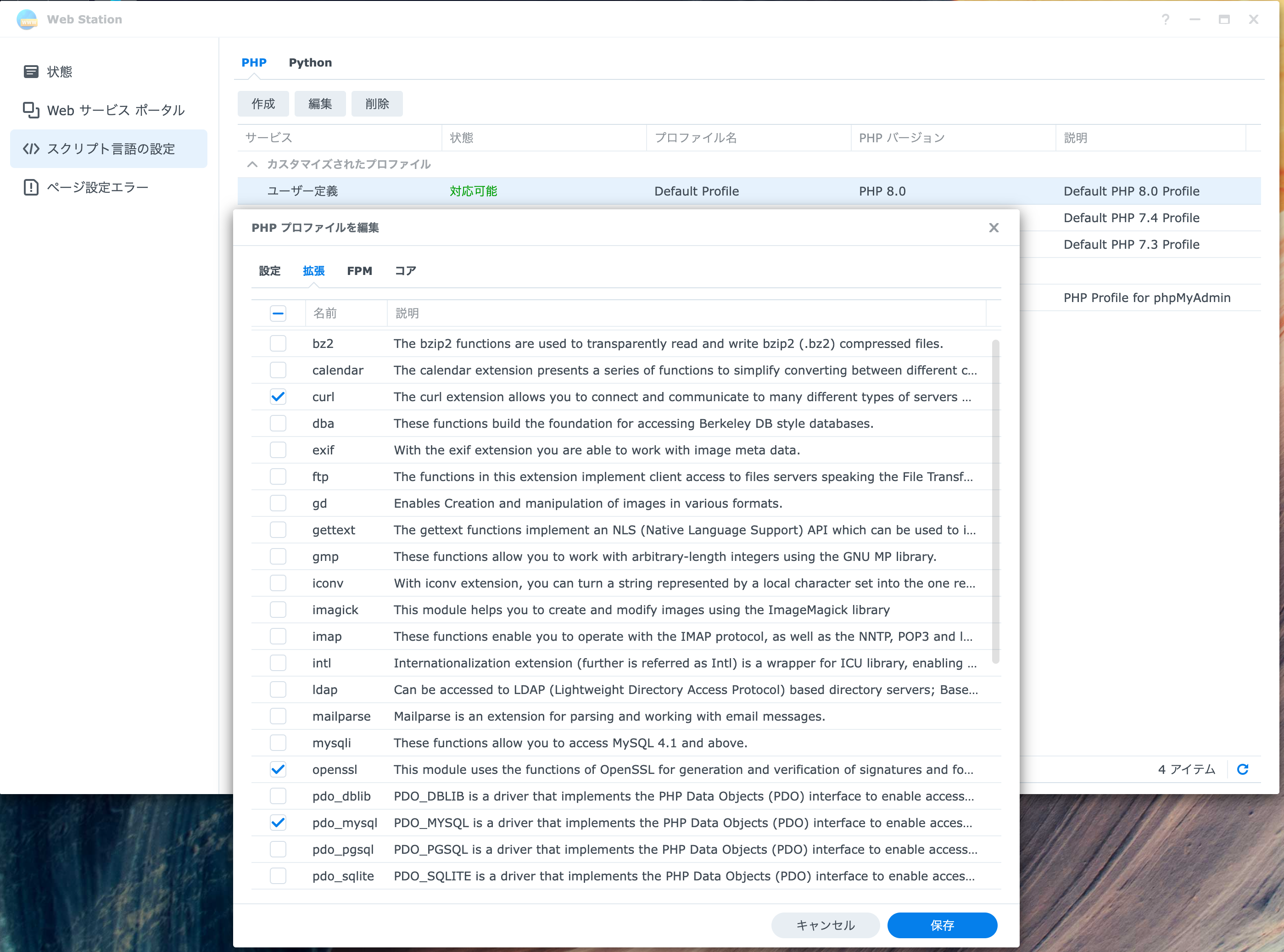 Synology で運用される場合、PHPの拡張にて、cURL、Pdo_mysql、OpenSSL を含める必要があります。